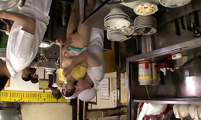 Kitchen maid in Asia Store gets fucked by every stud in the Shop
