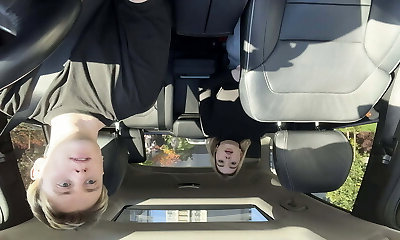 A young girl on the way gives in her narrow donk on the road in the car