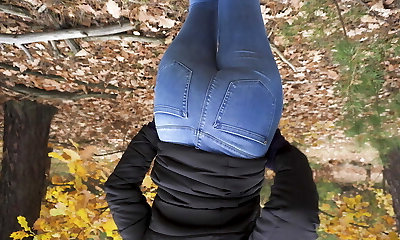 Amateur Teenager In Blue Jeans Taunting Her Tight Ass In The Forest