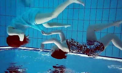 2 beautiful girls swimming naked in a pool