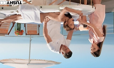 Lucky exotic girl enjoys her adventure with two erected peckers