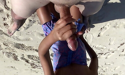 Hot Asian girlfriend flashes her tits and faps cock on beach