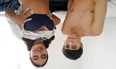 Black cheerleader in white stockings is busy with riding white stiff pink cigar