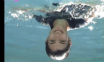 Buxomy and beautiful new redhead babe in the pool undresses underwater